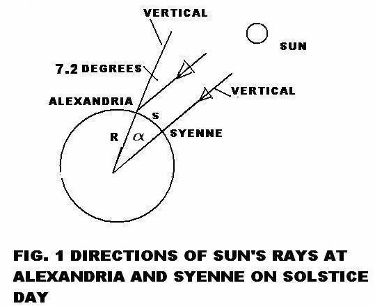 Let us see what had already happened in Egypt at the time of Eratosthenes who had also measured earth’s circumference from his observations between Alexandria (31.5° N ) and Syenne ( at Tropic of Cancer at 24°N ) on the summer solstice day in 200 BC. This experiment can be understood by looking at Fig. 1. The angle a at the center of the earth would be equal to