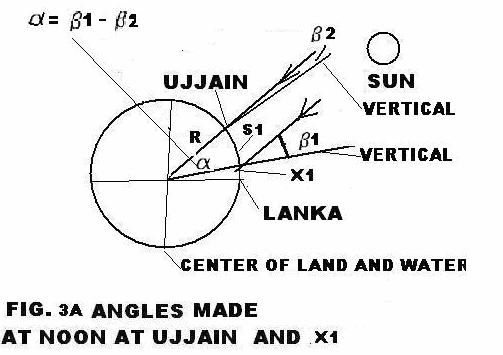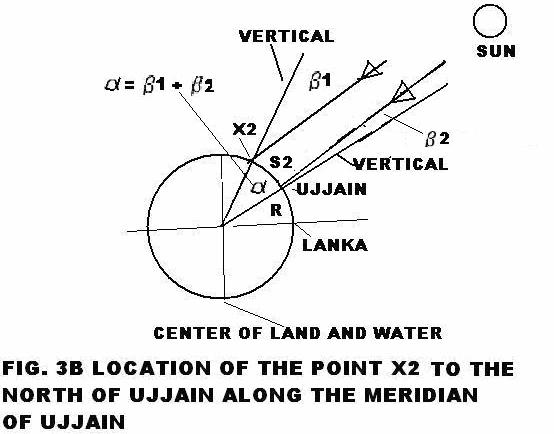 So, just like in Egypt, one can select Ujjain at the Tropic of Cancer and one other location either X1 ( to the south ) or X2 ( to the North ), and carry out experiments just like Eratosthenes. The relationship between the arc distance along the earth’s surface, and the angle at the center of the earth are shown in Figs 3A, and 3B respectively.