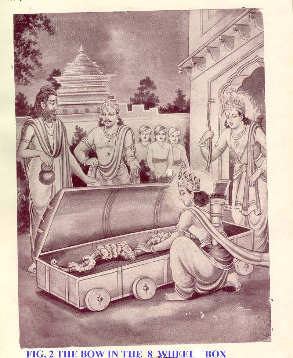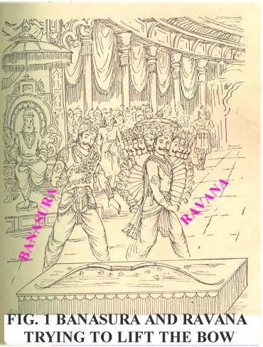 shows the Bow that was used to select the proper person to marry Sitajee, as described in the Valmiki Ramayana . King Janaka had set the condition that whosoever lifts this Bow, can marry his daughter Sita . Fig. 1 shows Ravana, and Banasura who were trying their luck to lift this Bow ( Ramcharit Maanas by Saint Tulsidas ). The description of how this Bow was brought for lifting is shown in Fig. 3
