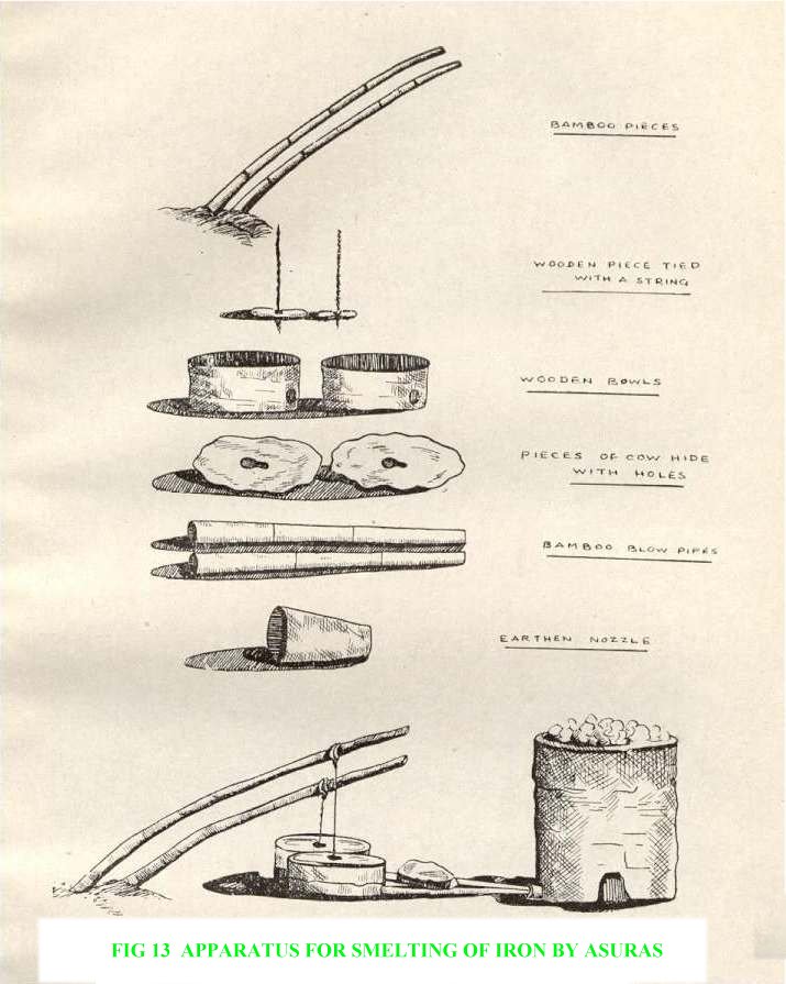 . In Figs. 13, and 14, the Asuras are shown smelting iron near Netarhat ( refer to Fig. 4 ) . This picture was taken during the sixtees of the last century [ Possehl,. and Gullapalli, 1999 ] . These Asuras are known to smelt iron in large numbers in the nineteenth century, and before.