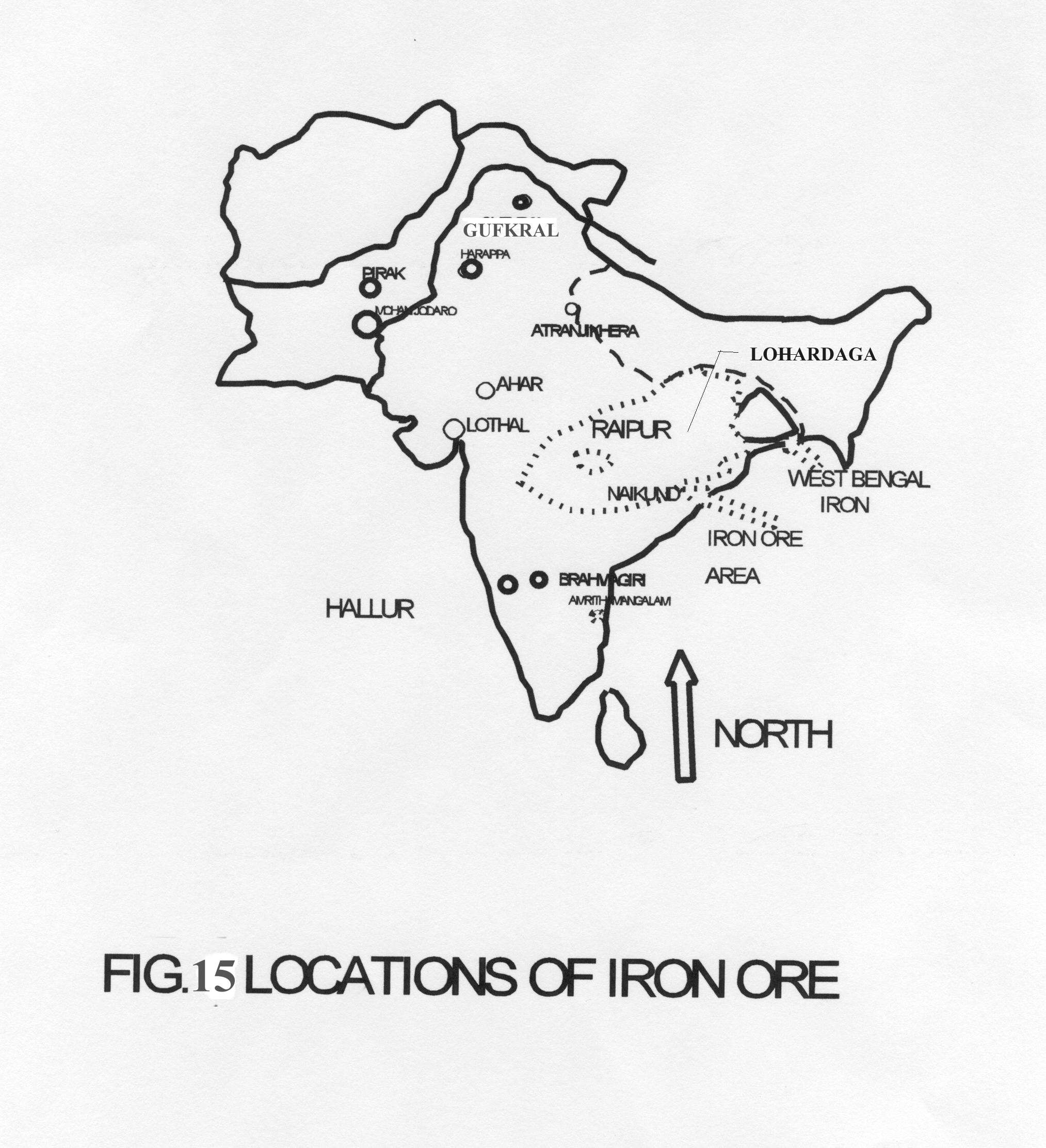 where iron was smelted during the Megalithic Age - around 2000 BC. This area is close to the locations of the Harappan Civilization. The author of this paper mentions about iron smelting , later in the Gandhara area nearby . Biswas [1995 ] has identified three main areas where iron is known to be smelted since the ancient times. These areas are : ( 1 ) Atranjikhera ( Fig. 15 ) near Delhi or Aligarh ( Uttar Pradesh ) , ( 2 ) Singhbhum - Raipur areas where Asuras and Gond tribals live , and ( 3 ) Karnataka and Tamilnadu areas where one can see places like Paiyampalli ( again Neolithic- Megalithic ),which is in the Arcot district of Tamilnadu, where iron was smelted .
