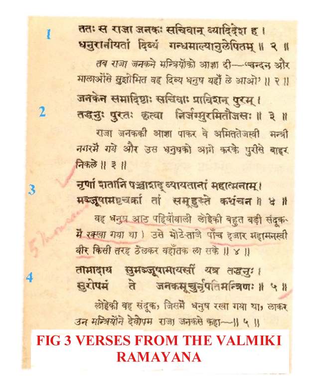 as mentioned in the Valmiki Ramayana . The appropriate verses number from 1 to 4 . These verses are in Sanskrit with their Hindi translation is written below each of the verses. Did the person who translated these verses not realize that iron( Loha ) did not exist in those days ? Fig. 2