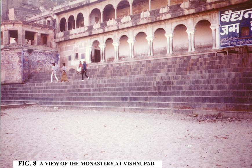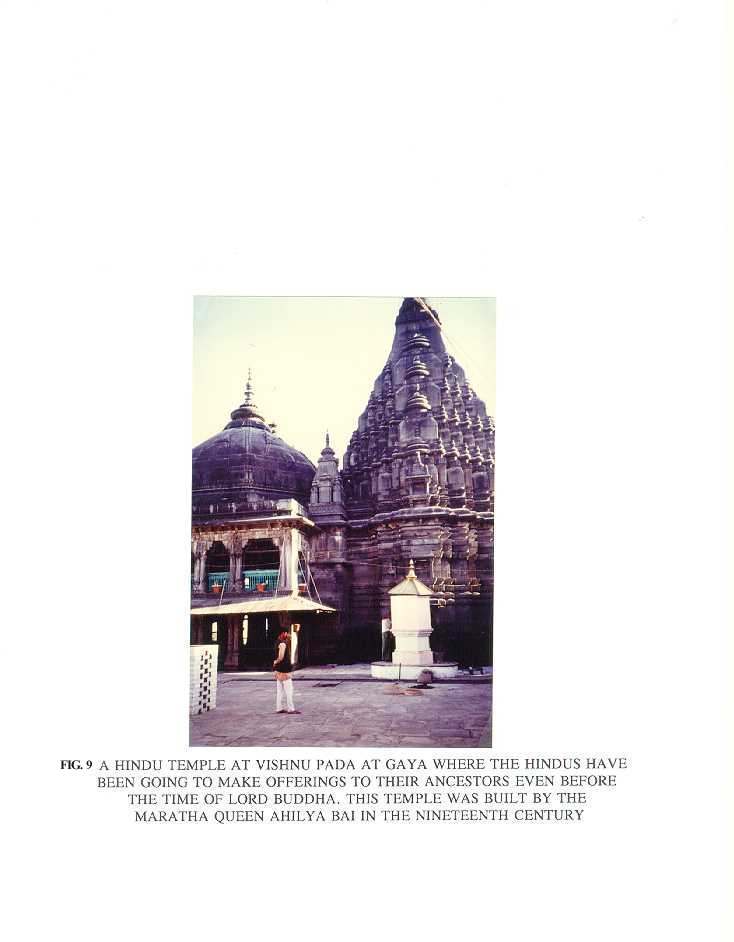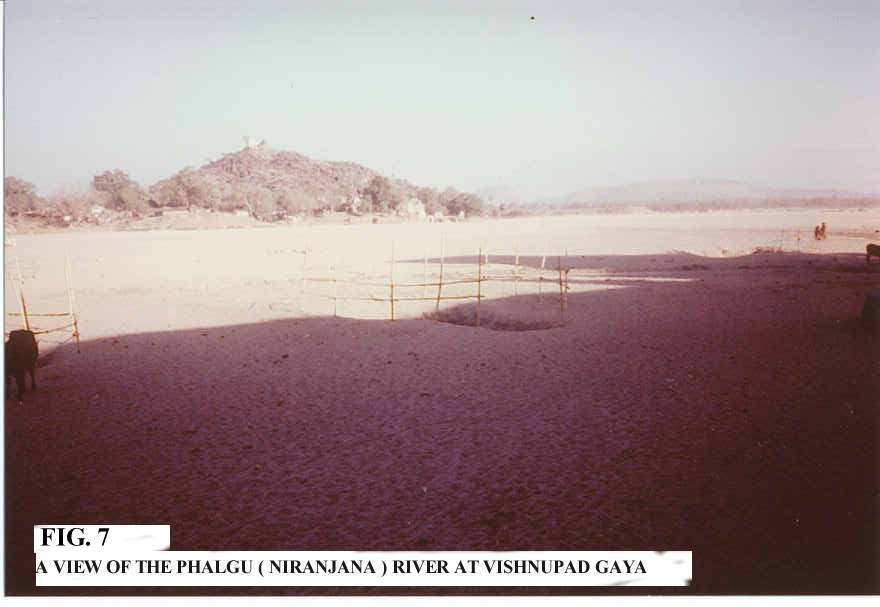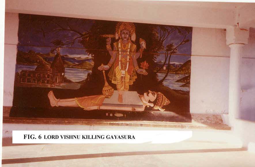 show pictures of Vishnupad at Gaya , a place where the Hindus go to offer water to their fore-fathers . In Fig. 6, one can see Lord Vishnu killing Gayasura which can be written as Gaya - asura. Fig. 7 shows the Phalgu ( Niranjana ) river where the water is offered, and Fig. 8, the monastery at that location. Adi Shankaracharya had visited here during his travels around India. The temple at this place is shown in Fig. 9.